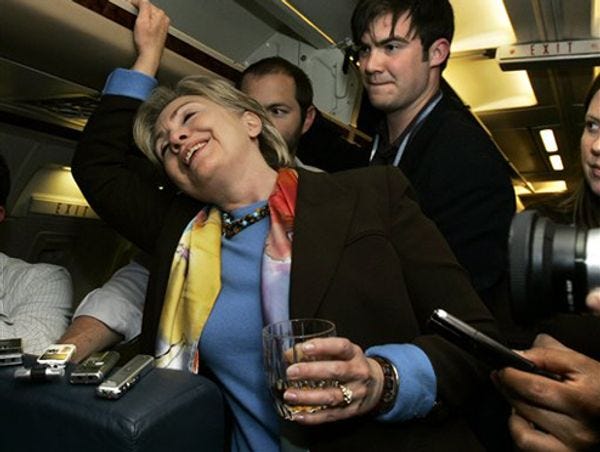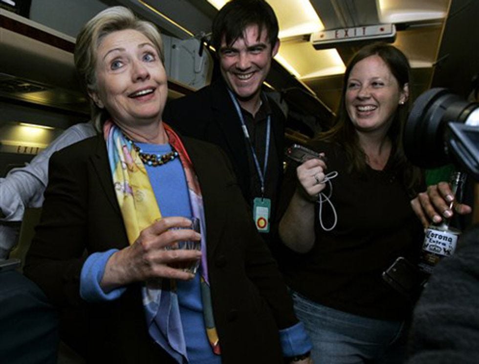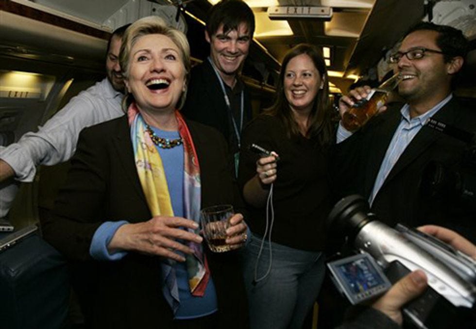 Why is Hillary Clinton embarrassing herself so much with this disenfranchisement bullshit, or the other bullshit with which she's embarrassing herself? It's because she is drunk, very drunk, all the time, forever, so drunk that she cannot DO ANYTHING -- LOOK AT HER. Obama would be drunk too, all the time, but he wants to be a strong black role model. [Sigh]. More pictures of Hillary getting drunk again with reporters on her airplane, after the jump!