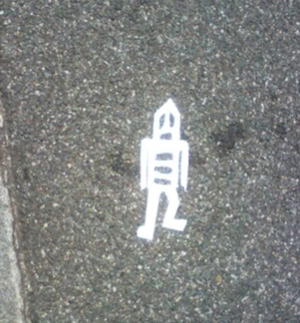 Wonkette omen operative "Jacklyn" sends us this photo and writes, "Does anyone know what these paintings are or why they are there? They are painted on streets all around the Mall… 3rd, 4th, and 7th, Streets NW at least." We have no clue but are willing to conjecture: In ten days, a race of oversized, porous ribbed condoms from Outer Space will destroy this city and rebuild it as five-star day spa. Any other theories?