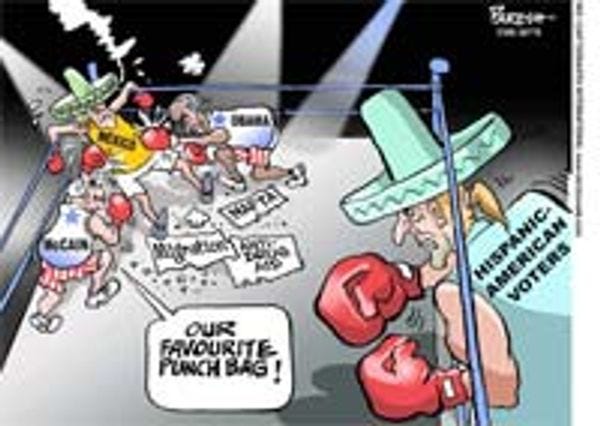 Wacky Foreign take: Our supposedly honest and decent candidates are nothing more than a pair of sinisterly grinning thuggish boxers, raining terribly kidney punches down on poor, innocent Mexico. But watch out, fellas! Hispanic voters are coming to avenge their father, and they're thirty feet tall and blond for some reason. They will crush you with a single swipe of their mighty sombrero!