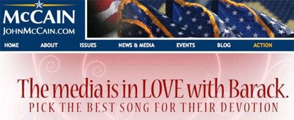 Sweet criminy, did Juan McCain send out a hot e-mail this morning or what: "It's pretty obvious that the media has a bizarre fascination with Barack Obama. Some may even say it's a love affair. We want you to be the judge. We've compiled two videos of the more outrageous moments of this not so secret love affair." Indeed, it's very similar to the "secret love affairs" that John McCain had during hisfirst marriage, and more recently too, and also with the media.