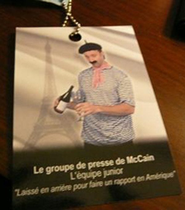 Last night the McCain folks were handing out press credentials with a ridiculous bereted Frenchman on them, we are not sure why, but that dude looks suspiciously like the mustachioed sophisticate who appeared in our own "The Foreigns" column, which ran back when there was still international news and our columnist was not aJeopardy!celebrity.