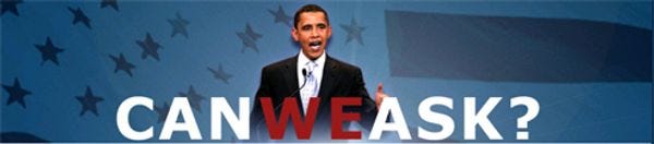 John McCain might have a crappy old web site that sells golfing gear, but the Republican National Committee is running a very sophisticated Interwebs operation on his behalf. It is so sophisticated that they finally stopped the clock counting how many days had passed since Obama had been to Iraq, and maybe they will even reset it next week, after the clock-winder gets back from his vacation in Orlando. But the very best part of this web site is a section called "Can We Ask?", where visitors get to ask Barack Obama questions. They are predictably hilarious.