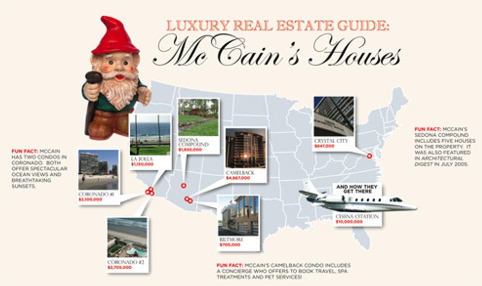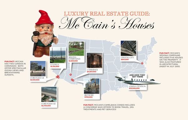 The DNC has sent us this lovely map of John McCain's houses and airplanes and gnome slaves. Since they've made it terribly unreadable, you may view it full size in right here . But to the point: this is devastating you see! Because most of his properties are "condominiums," a fancy rich word that the well-to-do use when referring to what common folks call "apartments." And can you even believe this Fun Fact that one of McCain's "condos" -- that is rich slang for "condominiums" -- has a concierge, a French word meaning, "house slave who shows rich people the least congested route to the airport during rush hour."