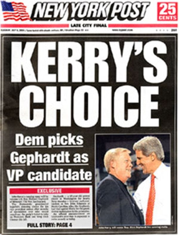 We were really pulling for Dick Gephardt, but it is looking more and more like Barry's Number Two will be Texas Congressman Chet Edwards. (Unless it's Tim Kaine, or some other person! But not Hillary. ) This will prompt innumerable conversations about Obama's surprisingly poor political judgment in picking that Two Americas guy with dirt mansion and the baby mama and the cancer wife. [ AP ]