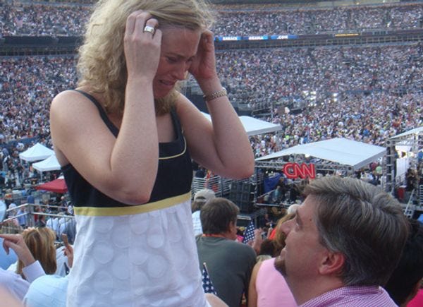 As you listen to this HORRIFYING thriller soundtrack playing in Invesco Field while Obama walks off, here's something cool that happened before the Secret Service apprehended us: a proposal, immediately in front. As soon as the would-be groom got on his knee, Al Gore walked on stage, and it almost seemed like the crowd's eruption was responding to this Hope Couple. Maybe it was. She said yes, and we obnoxiously took a photo.