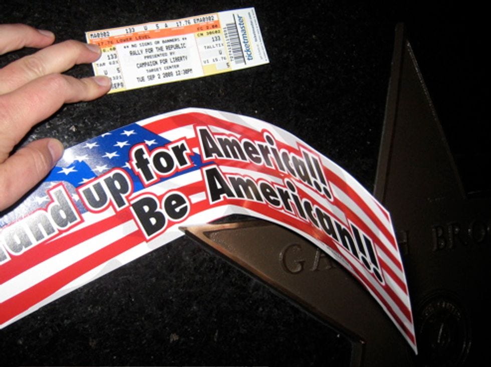 This was much better than going to the media room and telling Ron Paul's loyal media helpers that Ken Layne of Wonkette would like press credentials, which would've somehow resulted in assault charges, against your editor. Plus, free bumper stickers and shit! (There is a two-inch-thick pile of Paultard stuff sitting next to the desk here at the Wonkette suites, and some of it might be funny, but so far nobody wants to go through it or even touch it, really. If nothing else, the pocket-sized copies of the Constitution will be handy if we ever get a chance to make a move on Elizabeth Kucinich.)