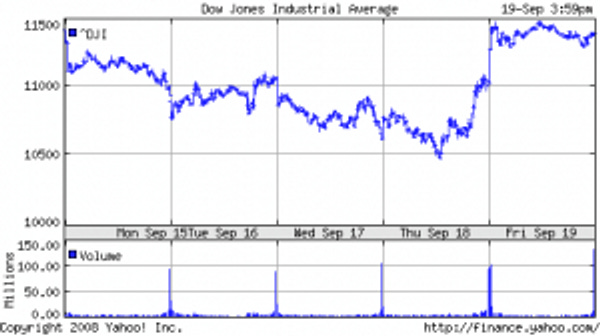 Well, that was a fun week in finance news. So what did the markets get, after the U.S. government decided to end market capitalism and become the Soviet Bank of Soviet America? Stocks ended the weekflat, that's what. Monday morning, the Dow opened at 11,421. Today, after this unprecedented nationalization of AIG and promises of some "We Buy Your Crap" market run by the Fed, the DJIA closed at 11,388. (The S&P 500 was about the same, starting the week at 1,252 and ending at 1,256.) A half-trillion in new U.S. debt just doesn't buy what it used to! [ Schaeffers Research ]