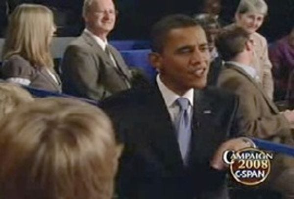 00: 01:20 -- The snub. Obama reaches out to shake McCain's hand. McCain makes a weird face and points to Cindy McCain. Nonplussed, Obama smiles and takes her hand, says some pleasantries, and returns to the voters in the audience.