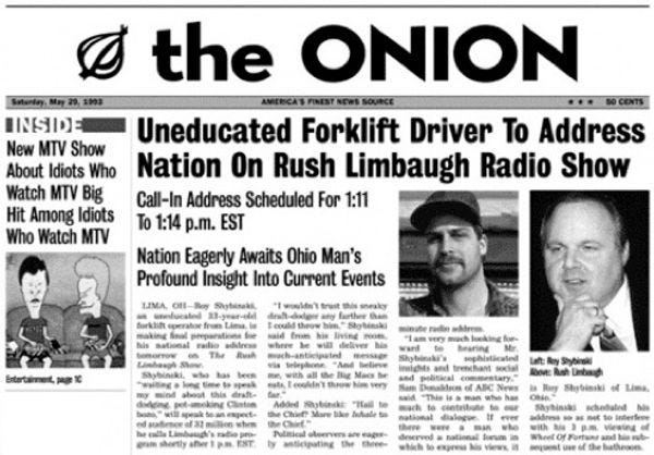 Yup, a1993page from the 1999 Onion bookOur Dumb Centurywith this article and subhed, "Nation Eagerly Awaits Ohio Man's Profound Insights Into Current Events." See, everyone, just make up a story -- type any random crap in your comments about anything, just try it! -- and American capitalism can make it happen. [ The Onion via BoingBoing ]
