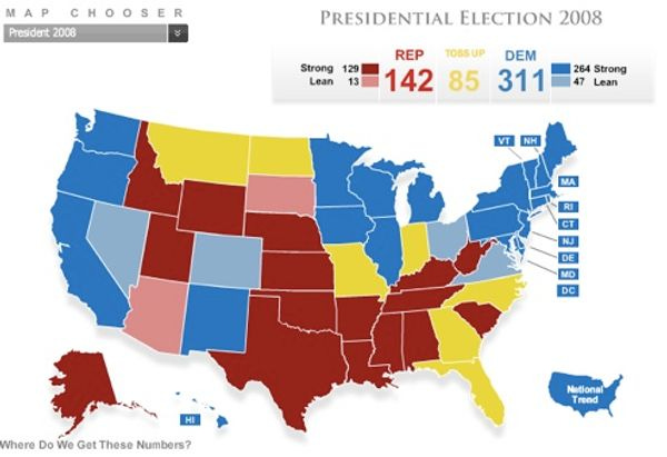 Otherwise, Obama appears to have a +2-5 advantage in Ohio and a +2-3 advantage in Florida. Missouri and North Carolina are insanely tied. McCain has a slight advantage in Indiana and Georgia. None of this matters except to you meanies who want to run up the score on poor Walnuts.