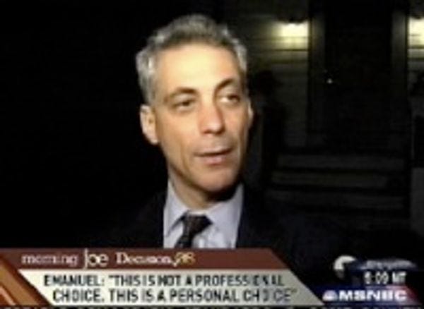 Possible next White House Chief of Staff Rahm Emanuel is being terribly cruel to his fan base by reminding them that he is already married, with children. "I do know something about the White House and I have children now. I have a family," he told WLS-TV in Chicago. These "children" of his might require more of his time or something, more time than a Chief of Staff could really afford, so he might have to stick with his day job of being a huge dick to all his colleagues in the House of Representatives. Why is he playing so hard to get?