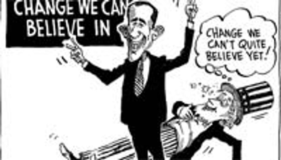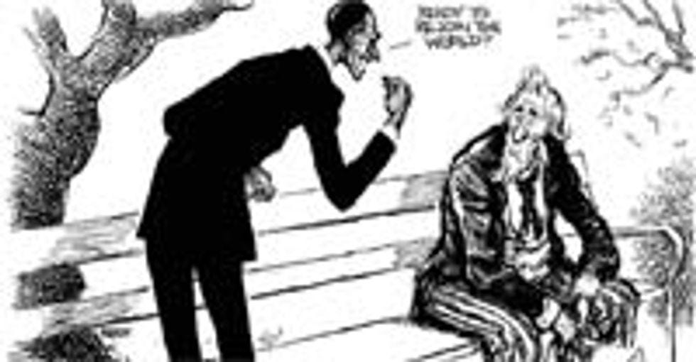 As you can see, Uncle Sam has had a rough eight years! And as he's the symbol of our once-great nation, the myriad awfulness of the Bush administration left him in dire straits: as a shabby hobo, sitting on a bench in the middle of the day because there's nothing to do until that government check comes through and he can buy more Sterno. But here comes a handsome fellow who offers to help lift him back up to his proper place in the world! Sure, Uncle Sam's never heard of the guy, but how much worse can it get? Our hobo uncle has Hope!