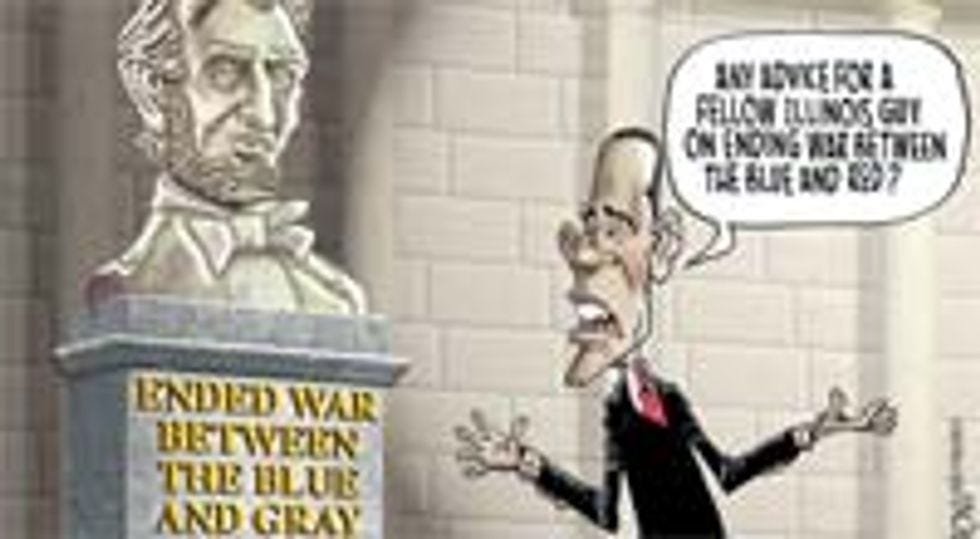 Having had his way with our beloved national symbol, Obama now needs to figure out how to heal the political partisanship and hostility that afflicts our nation. As many presidents have done before him, he turns for advice to the preserved head of Abraham Lincoln, kept in a conscious-yet-undead state through terrible voodoo magic. Obama asks Lincoln how he ended the war between the blue and the gray, and Lincoln explains that he sent enormous armies into the south that smashed the rebels with artillery fire, then burned down the major cities and destroyed the infrastructure.
