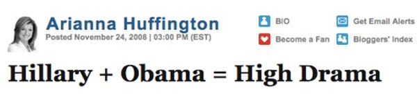We'll put this nicely since we don't wish to become victims of Gawker-style HuffPo blogroll revenge: GIVE THE POOR DUO A CHANCE, FAIREST ARIANNA! She writes in this column of hers, "It's a Nora Ephron romantic comedy.When Hillary Met Barack. Sleepless in Chappaqua. You've Got Fundraising Email. Two intensely driven politicians cross paths, each seeking the highest office in the land -- talk about a cute meet!" Just... gahh... hmm... we see the writerly device here and it'strite vapid plagiarism of Maureen Dowdnot veryedifying.Look. This selection process has been the most drama-free thing a Clinton has ever done. Celebrate! [ HuffPo ]