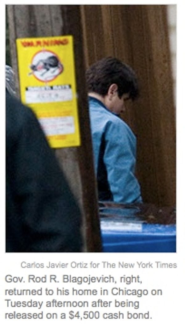 Wonkette political symbolism operative "Nicole" informs us of this photograph from the liberalNew York Timesdepicting Blaggy, dressed to the nines, leaving prison after his best friend Barack Obama posted bail. We have a hunch that the very artistic NYT photographer was "going for something" by including this haunting poster of a common Chicago street rat in the foreground. It is a true fact that these posters are on every wall and telephone wire pole in Chicago, near the actual rats. [ NYT ]