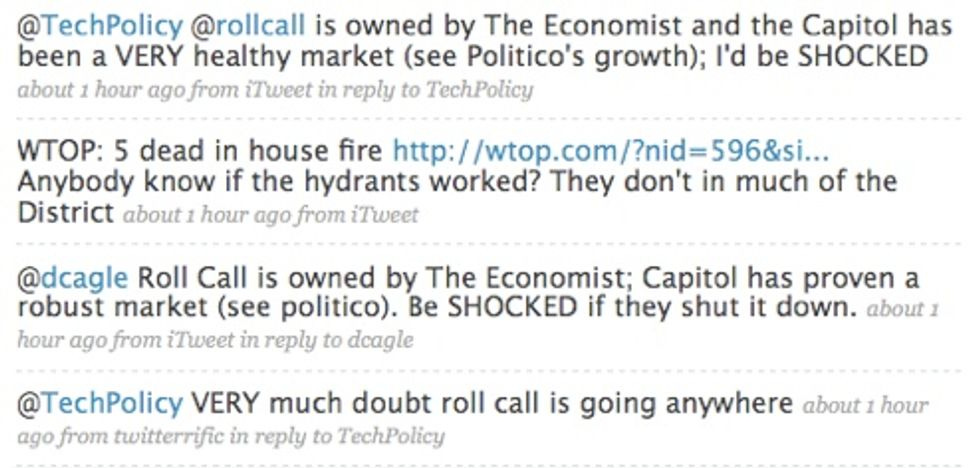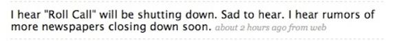 That's Chris Dorobek of Federal News Radio, writing three (3) Twitter dealies about howRoll Callwill be just fine. Thank God someone quashed this scurrilous rumor before Washington erupted in fires and riots and chaos and bank runs. Men havediedover lesser events than the threatened demise of our preciousRoll Call.
