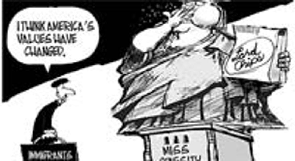 In his first act as president, Cheney finally solves the immigration problem once and for all, by transforming the formerly svelte and welcoming Statue of Liberty into a symbol of everything that foreigners hate and fear the most: fat ladies. "Madre di dios" cried the sinister illegal foreigns, "I will return to my own country, where the starvation and the cholera keep our women supermodel-thin!" Later, Americans riot in outrage when they find out that there really isn't any such thing as "lard chips."