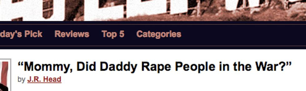 Hmm, we've never heard of any Hollywood movie about American soldiers raping people "in the War," at least not off the top of our heads... and it probably wouldn't occur to little children to ask this question, since they don't yet know that penises and vaginas are designed to "interact" and shouldn't see such terrible rape violence movies anyway. So... where is this coming from, Mr. Head? Is there... something the former Marine writer of this article would like to confess? From the war? Little... little rapin' action?