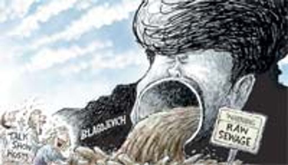 Here is another excellent metaphor! Blagojevich is depicted as some sort of giant statue-thing with an obscenely distended mouth, out of which is flowing a veritable river of human feces. Then there are three tiny people labeled "talk show hosts" who are frolicking and laughing in the shit-river, and even dipping their hands in it and splashing each other. The intended meaning is that Blagojevich is full of shit and the talk-show hosts who had him on their shows were willing to roll around in the filth! This is what passes for subtlety in political cartooning.