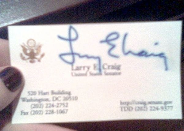 Wonkette queer memorabilia operative "Laura" has excavated the D.C. equivalent of a full velociraptor skeleton: "I was just cleaning my room and found Larry Craig's signed Senate business card in my underwear drawer (along with other mementos from a high school trip to DC). Holy crap! I don't know what to do with it! What do you think...eBay it or frame and hang it on my bathroom wall?" Laura for god's sake, IT BELONGS IN A MUSEUM. And take good care of it, it is probably deteriorating after years of being surrounded by Craig Kryponite.