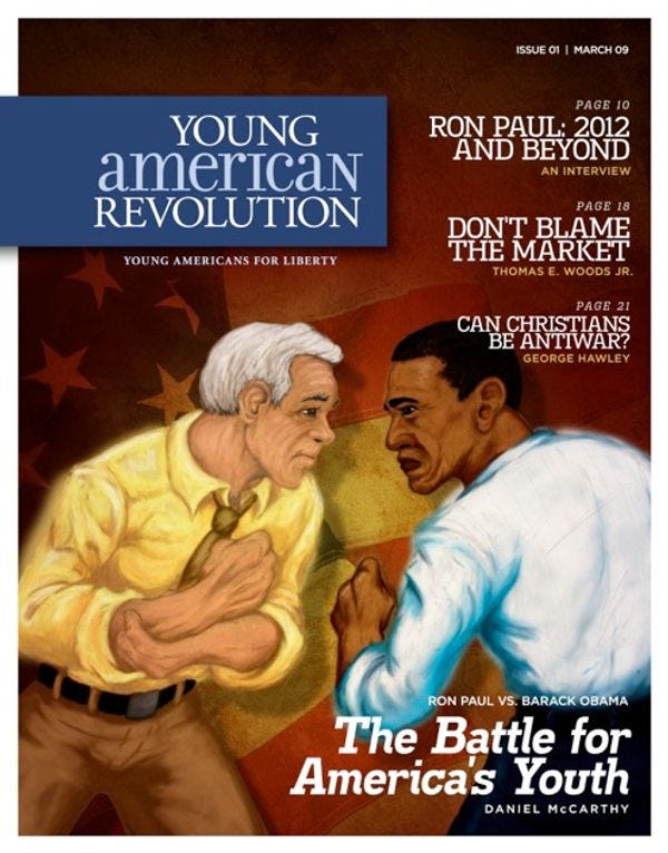 Ho ho ho, street thug Barack Obama is gonna kick whitey's ass clear back to Texas! Wait, whatisthis horrible thing? Oh, afanzinefor, uh, Ron Paul, the brief and inexplicable Internet fad of late 2007. (At least LOLcats were kind of funny!) Well listen up socialists, the elderly Texan congressman and very loosely aligned Republican is still alive and still has a few fans. They got together and made this "DIY" magazine. One of them drew this picture. For a donation of $500, you can hang a copy of this very drawing on your dorm wall or whatever. Chicks love this shit! Youth!