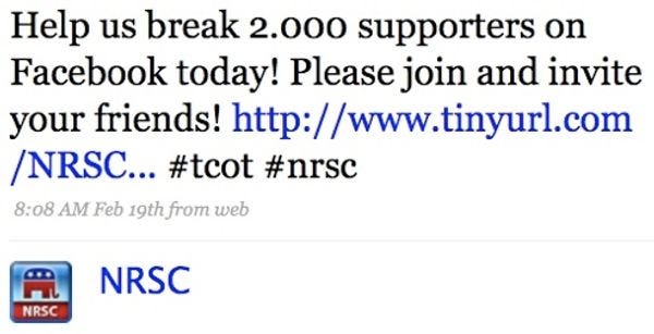 We all know that the Republicans control Twitter, but it looks like they're working on Facebook now. It would be astonishing, though, if the failed committee responsible for losing more than a dozen Senate seats in the last two elections were to get 2 "supporters" on Facebook. [ Twitter via Blue Gal ]