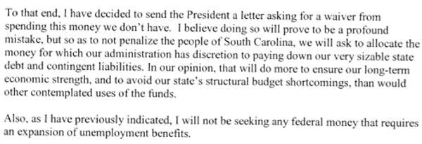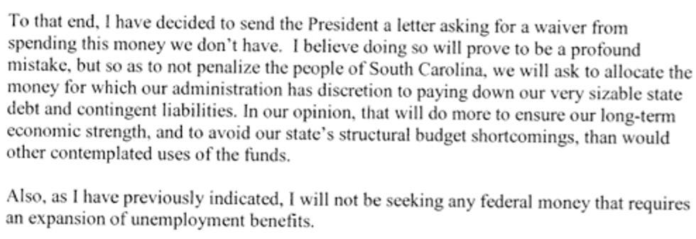 In sum: Mark Sanford has reasoned that spending $700 million in federal grant money -- another entity's money! Not from the state budget! -- to invest in the rebuilding of his shit-poor state would... ruin the state's finances forever?