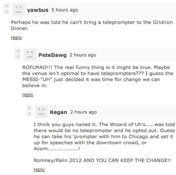 As some of you pointed out, the comments thread on that Fishbowl DC post we just linked to has some the best punditry we've seen the election. At least 75% of them make some scathing reference to the fact that Barack Obama uses teleprompters to deliver prepared speeches, like all Presidents and leaders and speakers have done since the invention of teleprompters and before that, when they read speeches from paper. There is literally no way that someone using a teleprompter to deliver a speech can be construed as controversial. Ha. But did you also know that pretty boy over there in the White House also wears "shoes" on his feet, like a retarded pussy? CAN'T HANDLE THE TERRAIN ON YOUR BARE FEET, HUSSEIN? [ FishbowlDC ]