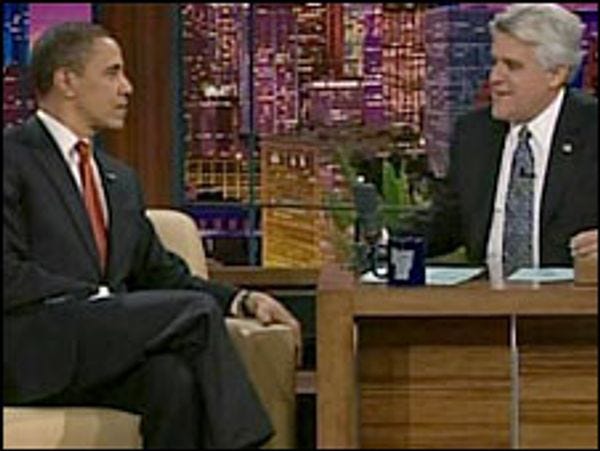 Hey all you elite cocktail-sipping Georgetown dandies gumming your cucumber sandwiches at tea time: Barack Obama is NOT overexposing himself with the daily live-teevee appearances and "town halls" and Jay Leno guest spots. In fact, this is how you make Americans love you, in this country. You just show up on every teevee show, laughing weirdly, dancing, saying vaguely untrue things, smiling, etc., and then your approval ratings just go up, up, up.