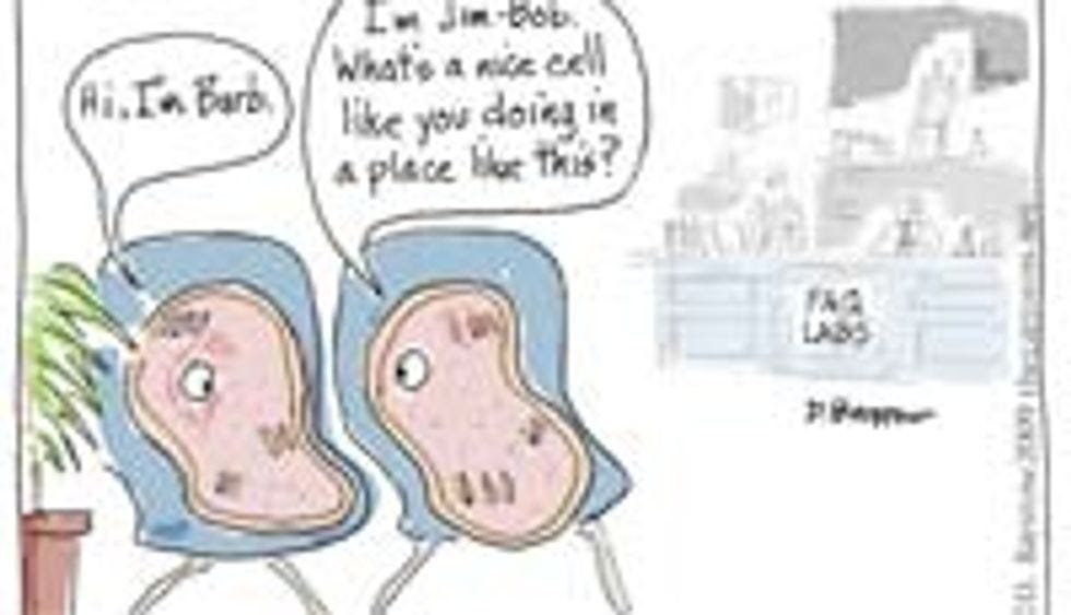 And it's not just humans who are getting in on the fuckfest action. Why, just imagine if stem cells were conservative, and could talk! They'd probably romance each other and have stem-sex, next to a potted plant! (What is it with these people and the potted plants? Is this some sick fetish I'm unaware of?) Anyway, these two stem cells are named "Barb" and "Jim-Bob," and they're obviously in the opening stages of sexy romance. You can tell they're conservative because they're actually exchanging names rather than just having sex right there on the chairs, like the liberals do; they won't actually have the stem-cell equivalent of intercourse until the third date, after they've pretended that they might get married, someday. Hooray for Jesus! No, seriously, I would be very grateful if someone could explain to me what the fuck this cartoon is supposed to be about.