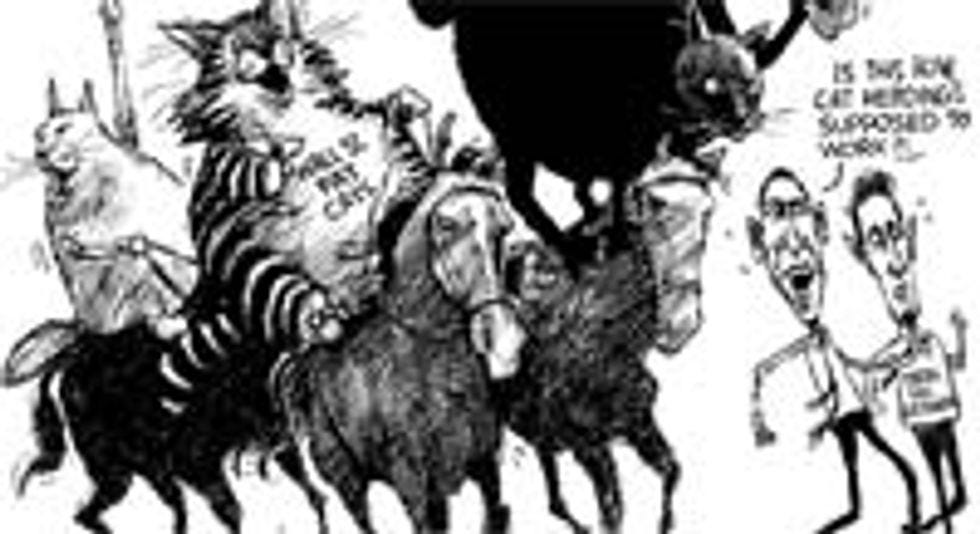 And how can we expect bored, horny Americans to keep their hands off of each other when America's national leaders are on the teevee saying giggle-worthy things like "stimulus package," all the time? This week, our political cartoonists offer a glimpse of the post-apocalyptic fuckfest that our nation will soon become.