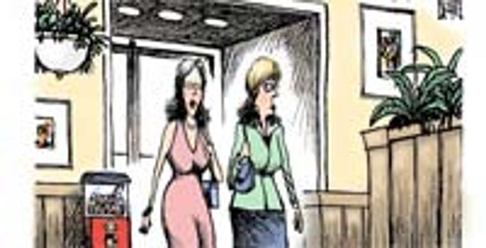 Checkthesesexy ladies out! With their lime-green suit jackets and slathered-on makeup, they're on theprowl!It's a good thing the management is selling morning-after pills from the gumball machine at this singles bar, because these chicks areready to fuckandeager to control their reproductive systems!And that's why they've come to the hottest singles scene in whatever terrible exurb they live in. Yes, the bright lighting, the pastel colors, the potted plants, the professionally framed art-like paintings, the wainscoting -- it all screams "decade-old Olive Garden showing its age" or "Holiday Inn Express lobby," which obviously gets everyone's juices flowing for some hot, drunken, unprotected intercourse, for the express purpose of creating tiny fertilized eggs that you can then prevent from implanting onto your uterine wallswithout a doctor's permission!Are you turned on yet?