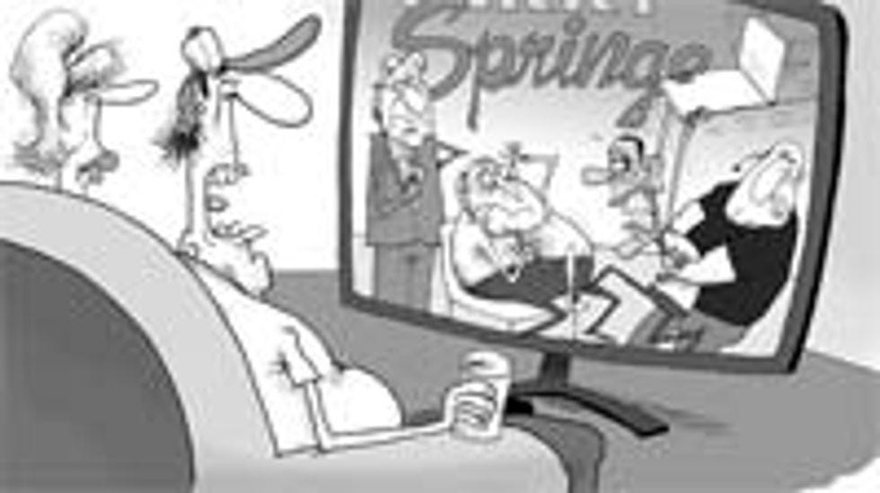 If your relationship has true drama -- if, for instance, it involves a sexy younger liberal black man and an older conservative white man -- its flameout could at least provide violent entertainment for fans of trashy daytime TV. Ha ha, look, the one dude is going to hit the other one with a chair! Now here is the problem with this cartoon: it is attempting to claim that Barack Obama is cheapening the presidency or some such with constant TV pandering. But surely a significant portion of the country would gladly tune in to any show in which the president attempted to bludgeon Dick Cheney with a piece of furniture, or, as appears to be the case here, merely threatened to do so in order to induce a massive heart attack.