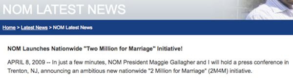 The very scary National Organization for Marriage folks have launched this new initiative, "2 Million For Marriage," about trolling for hot anal sex on Craigslist. This group is still not considered a parody, for the record. [ NOM via TPM ]