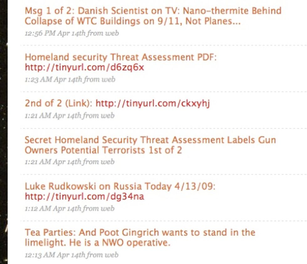 And, in an epic example of why the UN needs to shut down Twitter, now, here is "CitizenQuasar" in a fury over DHS keeping an eye out for crazy wingnuts, while also showing himself to be a 9/11 truther, while screaming about Newt Gingrich being an evil clown from the New World Order. (That last part is true, or at least itwastrue until Gingrich was kicked out of the NWO a decade ago for being too fat.)