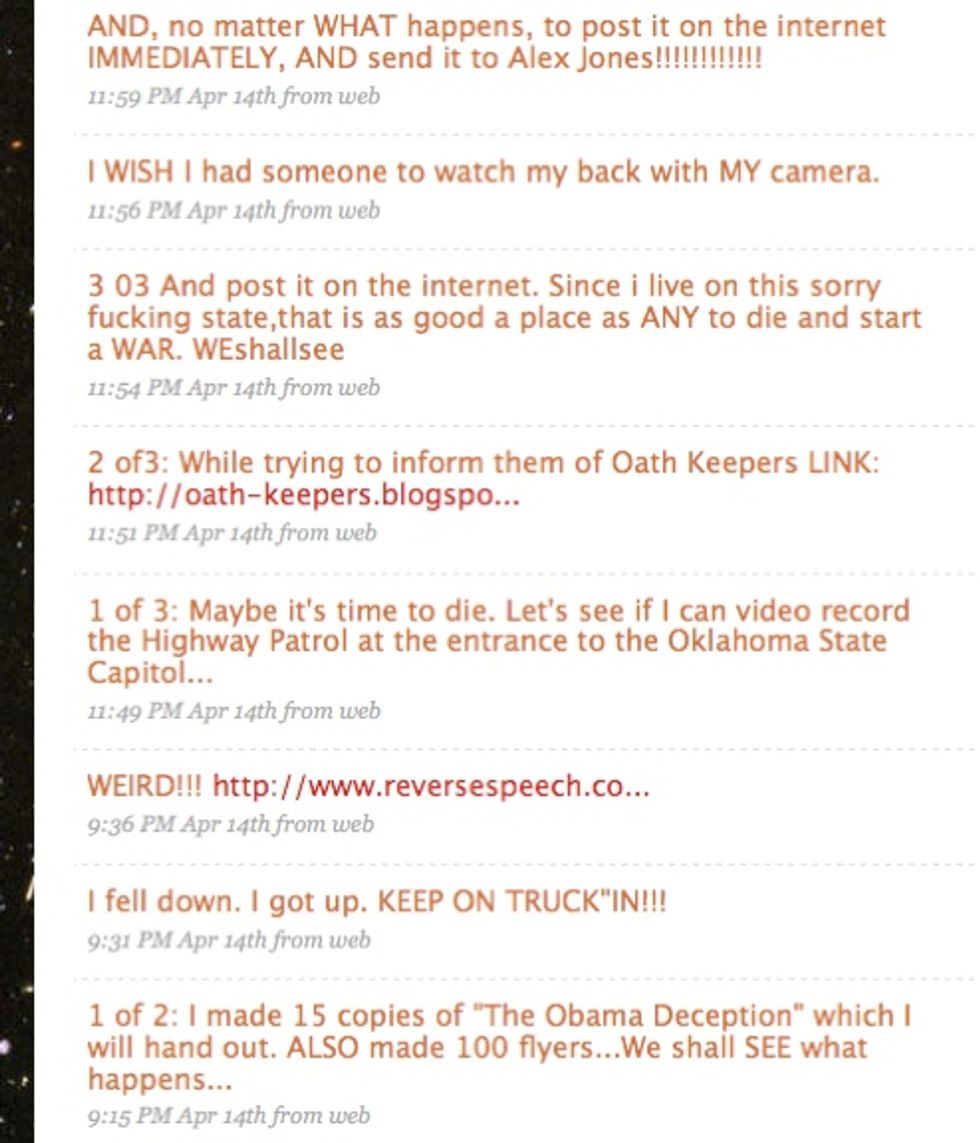 So, well, he was arrested. Luckily, his Twitter is still up, so we can all safely enjoy not only his insane rage, but his many links to Alice Cooper and Jethro Tull video clips. Yes, the guy is really a 52-year-old Oklahoman.
