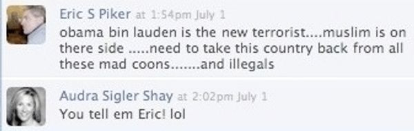Shay is just some 38-year-old "Young Republican" gal in Louisiana who was recently endorsed by Bobby "The Exorcist" Jindal to chair that fine youth organization for the under-40 GOP crowd. A fresh face, etc.! And she got one of those Facebook pages, so she could interact with her friends, the Young Republicans. In response to one such comment by a friend -- about how You Know Who is a commie Muslincoonillegal alien -- Shay typed an honest, simple reply: