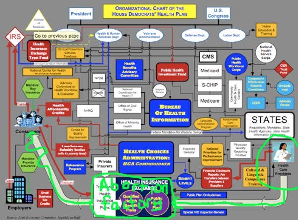 Aww, helpful orange minority leader John Boehner drew a pretty pictureprovingthat health care in the United States is complicated. Others have already noted that if John Boehner cares about simplicity above all else, then he should throw his weight behind a single payer system. But Wonkette subtext operative "Kathleen" unearths the real scandal here: under the current draft of the House Health Plan, all doctors would be BLACK WOMEN, and all "consumers" would be AMERICAN (white), and the "health insurance exchange" would just be a Ponzi scheme to collect reparations cash. [ Washington Monthly ]