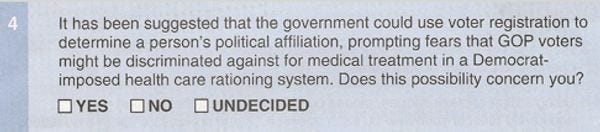 Intrepid Washington Independent blog reporter Dave Weigel has earned himself another steak 'n' baked dinner tonight by obtaining this, the RNC's "2009 Future of American Health Survey." YES. THAT IS LITERALLY QUESTION FOUR. Republicans, man! C'mon! Some of us just want to have a functioning polity here, okay? [ Washington Independent ]