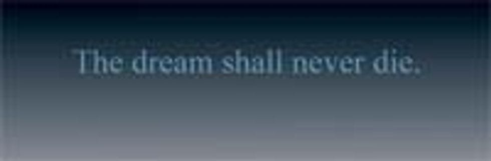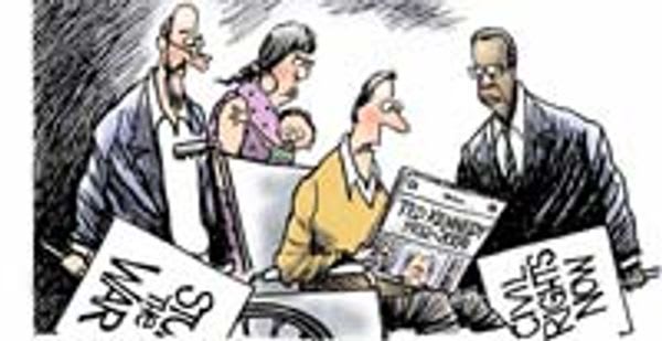 This cartoon trots out an old canard about the Kennedy family in general -- that they are hypercharismatic cult leaders building an army of liberal zombies who will do their every command (these commands generally involve destroying America, with socialism). Look at this cadre of Kennedy revolutionaries: a mother, an African-American gentleman, a man in a wheelchair, and bald beardy dude with a sign. They stare, numbly and glassy-eyed, at the newspaper announcing that their leader has passed on. Who will lead them to victory now? What do they have to live for?