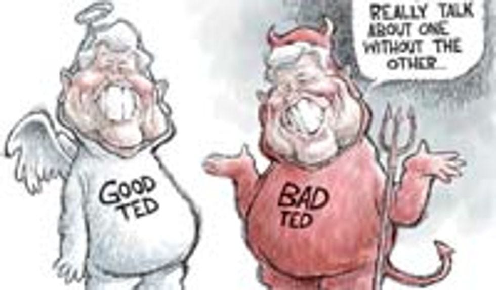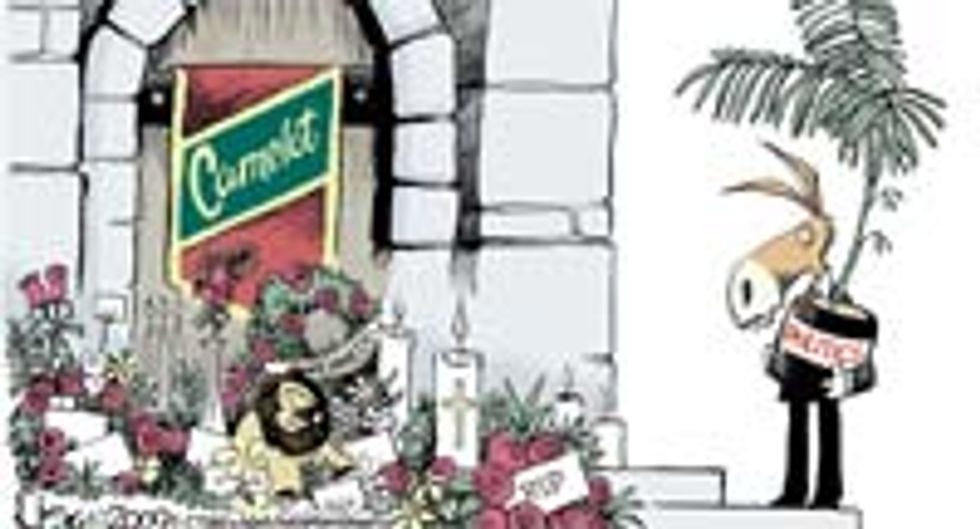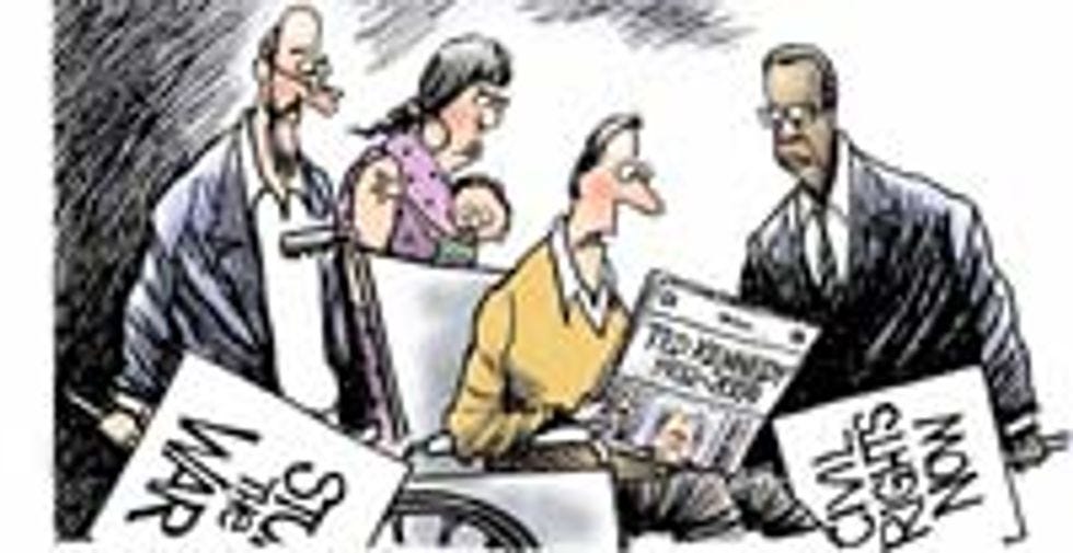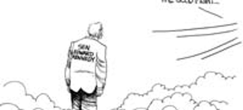 If there is one thing guaranteed to enrage America's arbiter of good taste, it is making any kind of snide remark about Ted Kennedy when he is ill or, in the current case, dead. Naturally, this rule has been flouted relentlessly for the past two days by the crassest, most awful people in the world, which is to say political cartoonists. Who are these heartless monsters, and why do they try so very hard to ruin our national conversation about how much we love Ted Kennedy?