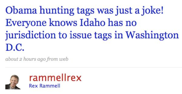 Idaho is nuts! "[Idaho Gov. caniddate Rex] Rammell was speaking to a local Republican group about the state's wolf hunt, for which hunters must pay for 'wolf tags.' An audience member shouted out a question about 'Obama tags.' 'Obama tags? We'd buy some of those,' Rammell responded." Haw haw haw. Even more haw-haws on the Twitter, just this afternoon! The longer he drags this out without apologizing, the more likely he is to win a Republican primary in Idaho. [ TPM ]
