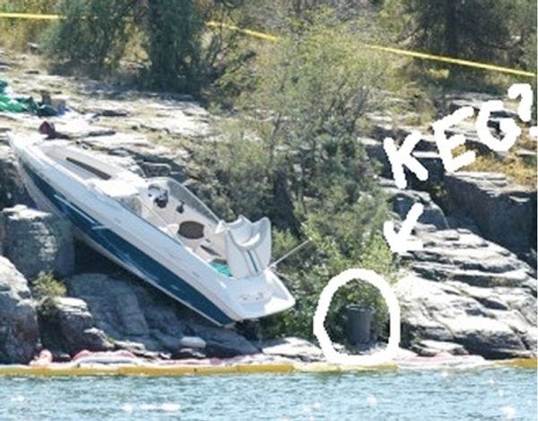 While Rep. Denny Rehberg's life, which is in stable condition, will be first on the docket during tonight's Wonkette Prayer Hour, we must wonder -- given his history of getting trashed in Kazakhstan and falling off horses -- exactly how wasted he and his buddies may or may not have been when they crashed their boat into very huge rocks late last night. And lo, "Twitter person Bob B." has sent us this photo of the wreckage, in which he thinks he has spotted the smoking gun: a keg of beer. It looks a little too skinny to be considered such in our estimation. Probably just a trash can. (They were throwing away the tree.) (While drunk?) [ Twitter ]