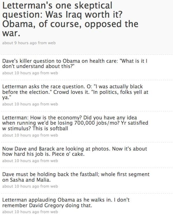 Here is Howard Kurtz, official professional media critic of both theWashington Postand CNN, doing some important, trenchant analysis, as one would expect of all esteemed journalistic savants in his position: Twittering snide, resentful barbs about the level of difficulty in television comedian David Letterman's questions to Barack Obama last night, on the Late Show. David Letterman clapped when his guest Barack Obama came onstage, guys! Howard Kurtz shall grade this human's journalistic skills as an "F-", he will. Tut tut, Letter-man! [ Howard Kurtz/Twitter ]