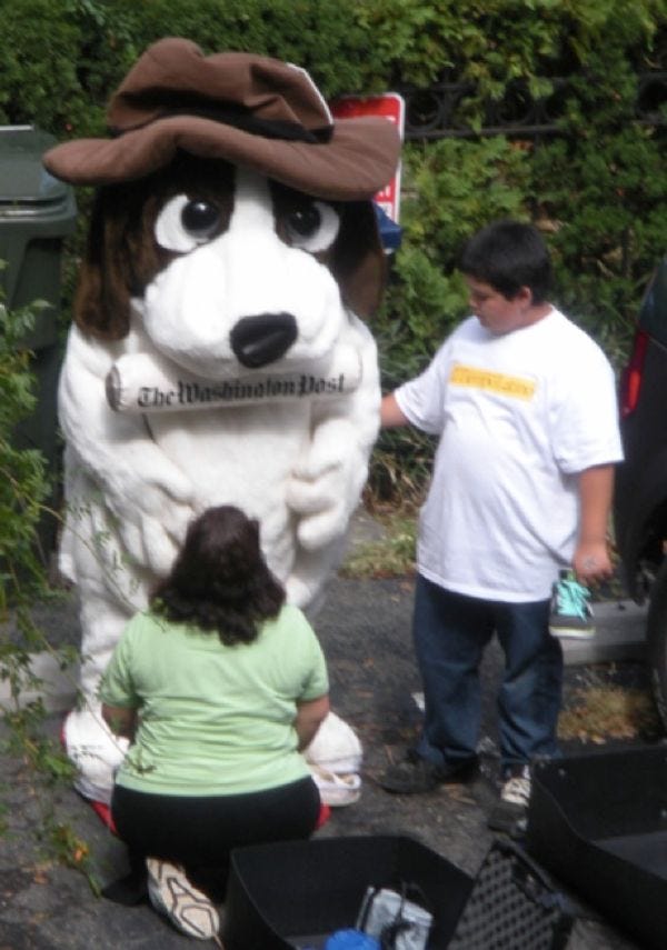 Wonkette's Newspaper Furry operative "Dan" sends this disturbing, secret sex picture and writes: "Attached for your pleasure is a digital photograph my girlfriend captured from my balcony. It was taken at this past weekend's 'Fiesta DC' Latino block-party in Mount Pleasant. The dog-thing is apparently the Washington Post's mascot (they have one??) who was getting dressed in a parking spot behind my building." Official furries paying for back-alley blowjobs while on duty: this is what theWashington Postcalls "journalism" now.
