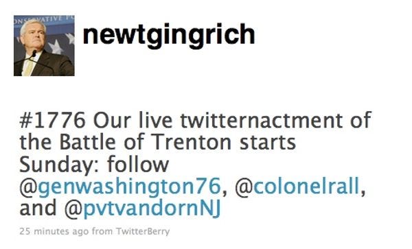 We don't even want to know the mechanics of this: "Washington, DC – To celebrate the launch of Newt Gingrich (@newtgingrich) and Bill Forstchen’s new book, To Try Men’s Souls, about the Christmas Night 1776 crossing of the Delaware River and attack on the Hessians stationed in Trenton, NJ, St. Martin’s Press and Gingrich Communications are excited to announce the first ever twitter reenactment of the crossing!" Intern Riley will be liveblogging this on Sunday! Yes, Riley, it's true! [ Newt.org ]