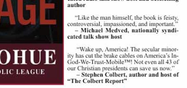 Oh please look at the tragic press release for Bill Donohue's new-ish book, Secular Sabotage . Not one person—not a single graphic design intern, or PR guy, or someone at the publisher's office—had any objection to including this blurb. Chilling. (Thank you to Wonkette Informant "Dan T.") [ Catholic League ]