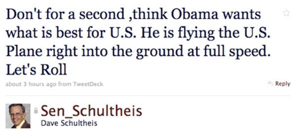 Ah, very true. It's the only logical conclusion, that President Barack Obama wanting to pass moderate bills incentivizing environmental responsibility (and maybe creating new jobs in the process) and providing basic health insurance to 30-40 million Americans makes him just like those 9/11 hijackers, and it's time to bumrush the cockpit and crash his Kenyan ass into the quaint Pennsylvania countryside, before he gets to Bush Junior. Colorado State Sen. Dave Schultheis meets Twitter, everyone.