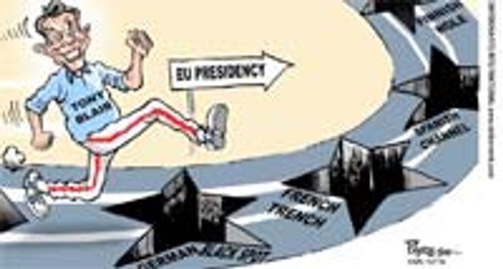 But let us turn our backs on Congress, and America, for the time being. What's going on with those kooky Foreigns? For instance, what's Tony Blair been up to since he quit his job as Queen Elizabeth's Royally Warranted Snuff-Wrangler and Chief Advisor On Lesser Non-Snuff-Related Matters? Well, apparently he's been working his way through every depraved sex act Europe has to offer! Now, sure, most of us have taken a dip in the "French Trench" or swum in the "Spanish Channel"; but how many can claim to have spent a lot of time in the "German Black Spot," or plunged into the fabled "Finnish Hole"? Truly Tony is a true man of the world.