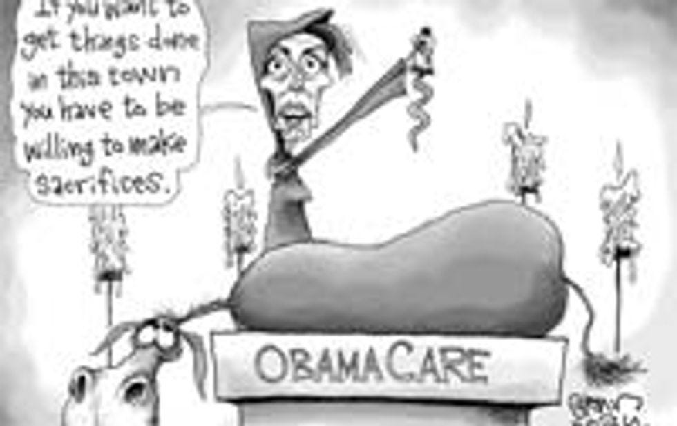 Oh, and somewhere in there these horse-sex freaks have to find time to pass laws and stuff. Now, in an institution with as long and storied a history as the United States Congress, there are bound to be some traditions that might look a little strange to the modern eye. For instance, historically, the Speaker of the House celebrates the passage of a particularly auspicious bit of legislation by putting on his or her finest Druid robes (a Snuggie can be substituted if necessary) and using a ritual silver dagger forged by Paul Revere himself to sacrifice to the Dark Lord whichever beast represents the majority party. This is actually a little-known bit of cost savings that has come about after the 2006 elections, as sacrificial donkeys are significantly cheaper to come by than sacrificial elephants, and require much less cleaning up after.